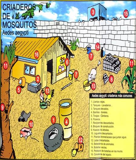 El mosquito que transmite el dengue, se desarrolla en envases caseros que puedan retener agua, tales como latas, barriles o tanques, llantas descartadas, floreros, y cualquier otro recipiente que contenga agua estancada.